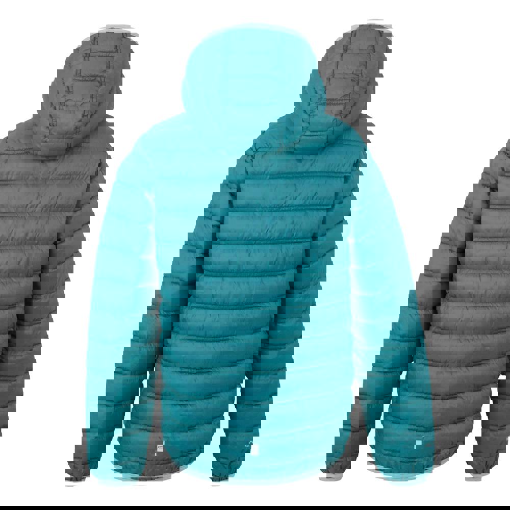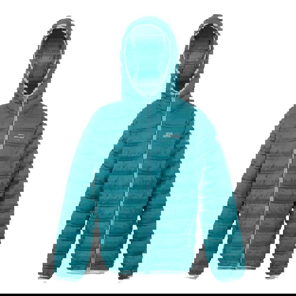 Regatta Kids Marizion hooded padded jacket in Storm Blue/Nordic Blue with a quilted finish and contrast trim. Made from 100% polyamide with a midweight synthetic fibre filling that is down and feather-free. The 20D fabric includes a DWR finish and is lightweight, insulating, water repellent and weather resistant.
