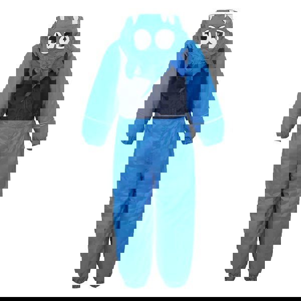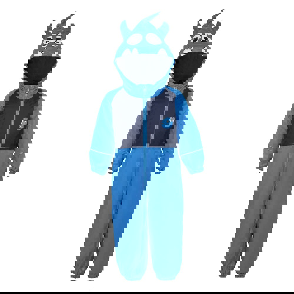 Regatta Kids Mudplay III Monster Waterproof Puddle Suit in Hydro Blue is made from 100% polyester Isolite fabric with a fleece lining. The hooded, long-sleeved design includes a grown-on hood with 3D detailing, plus logo and monster graphics.