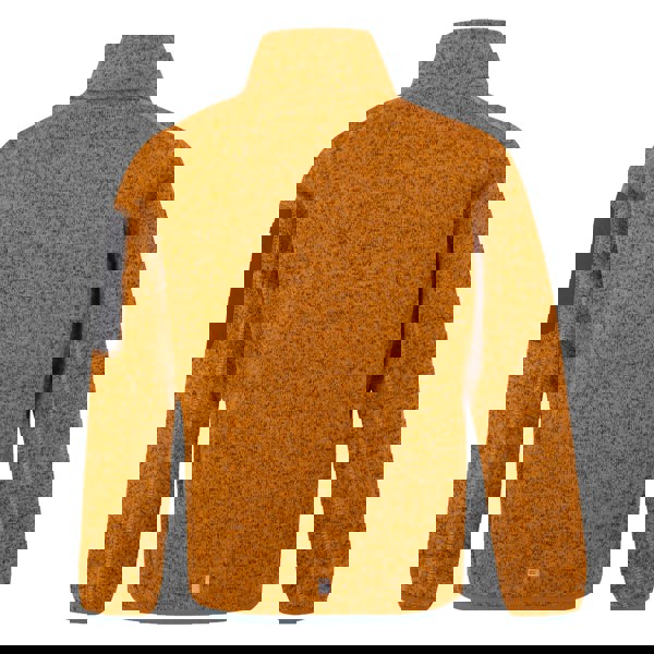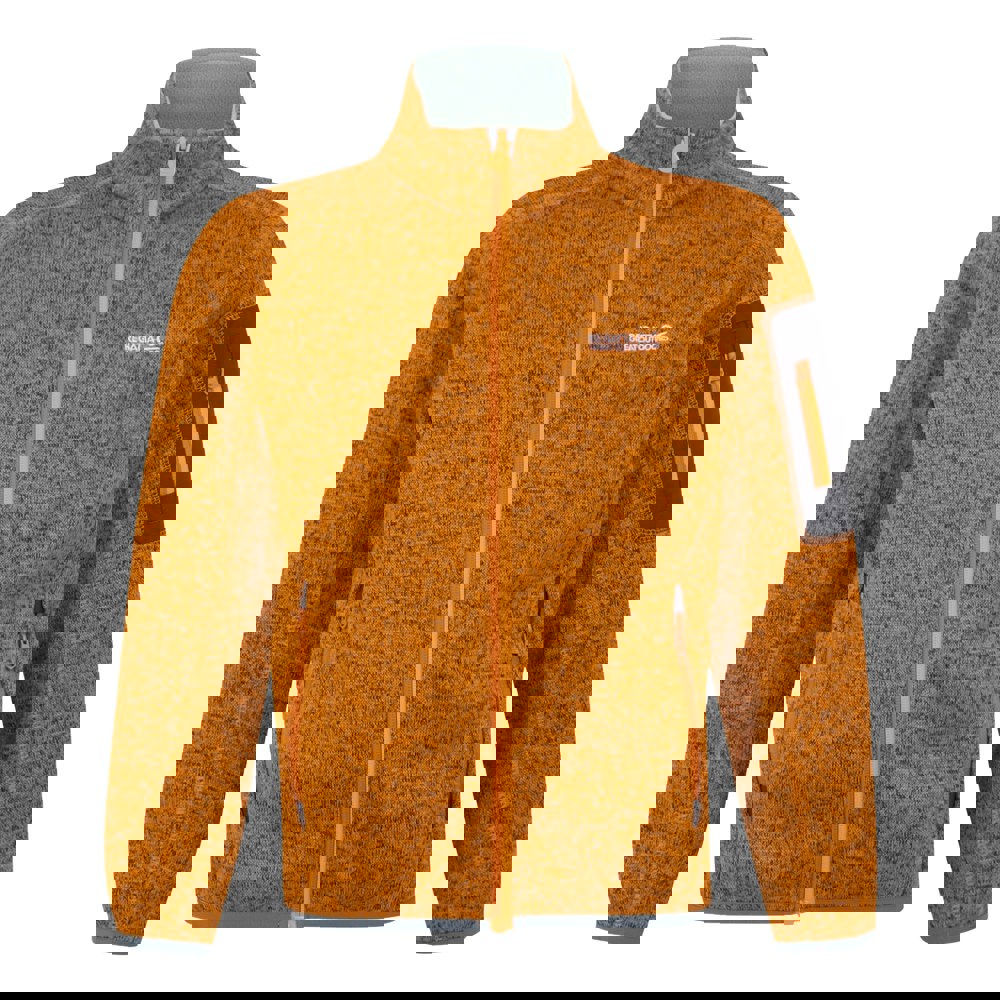 Regatta Kids Newhill fleece jacket in Bright Marigold/Glacier. Made from 100% polyester, this 250gsm fleece has a knit-effect marl finish with stretch for a comfort fit. Contrast detailing and a logo add definition, while reflective trim provides a clear visual accent.