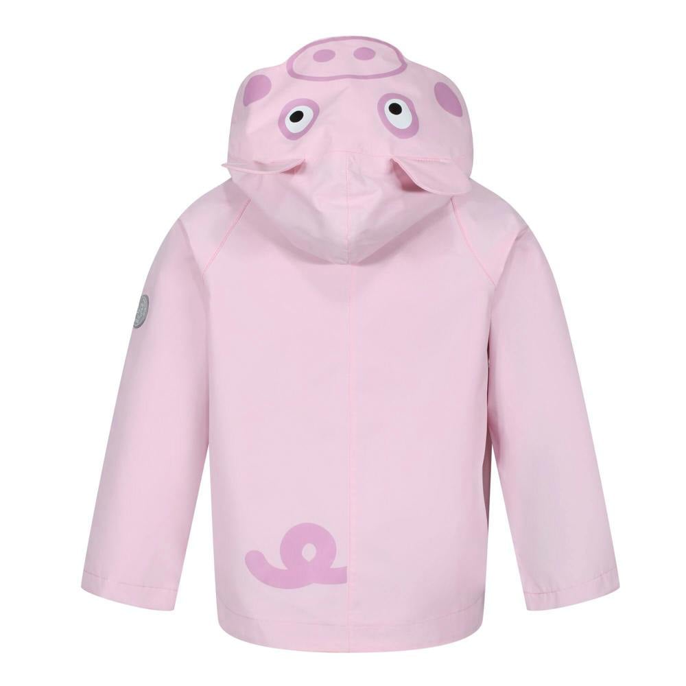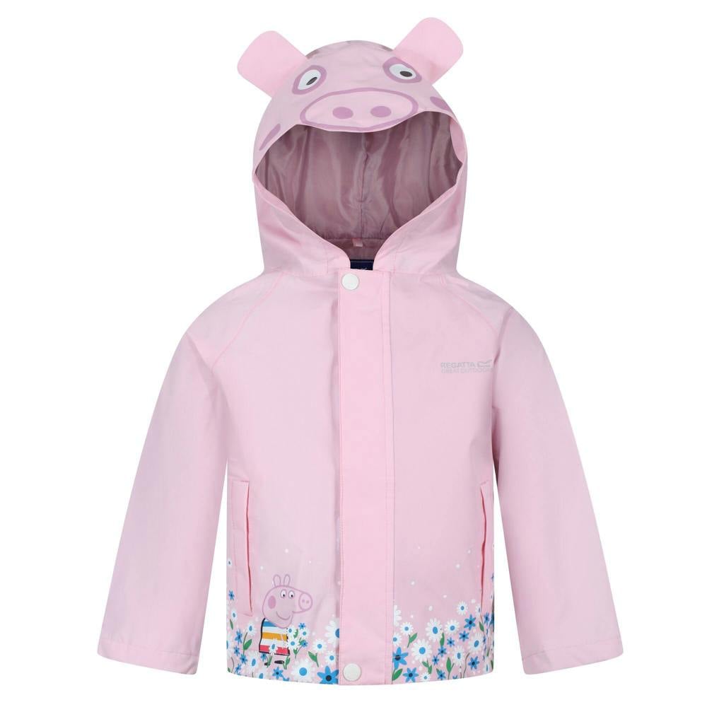 This kids’ hooded waterproof jacket from Regatta comes in Pink Mist with a printed floral and Peppa Pig design, finished with a logo detail and a sleeve patch. Made from 100% polyester Hydrafort fabric, it includes a DWR finish and sealed seams.