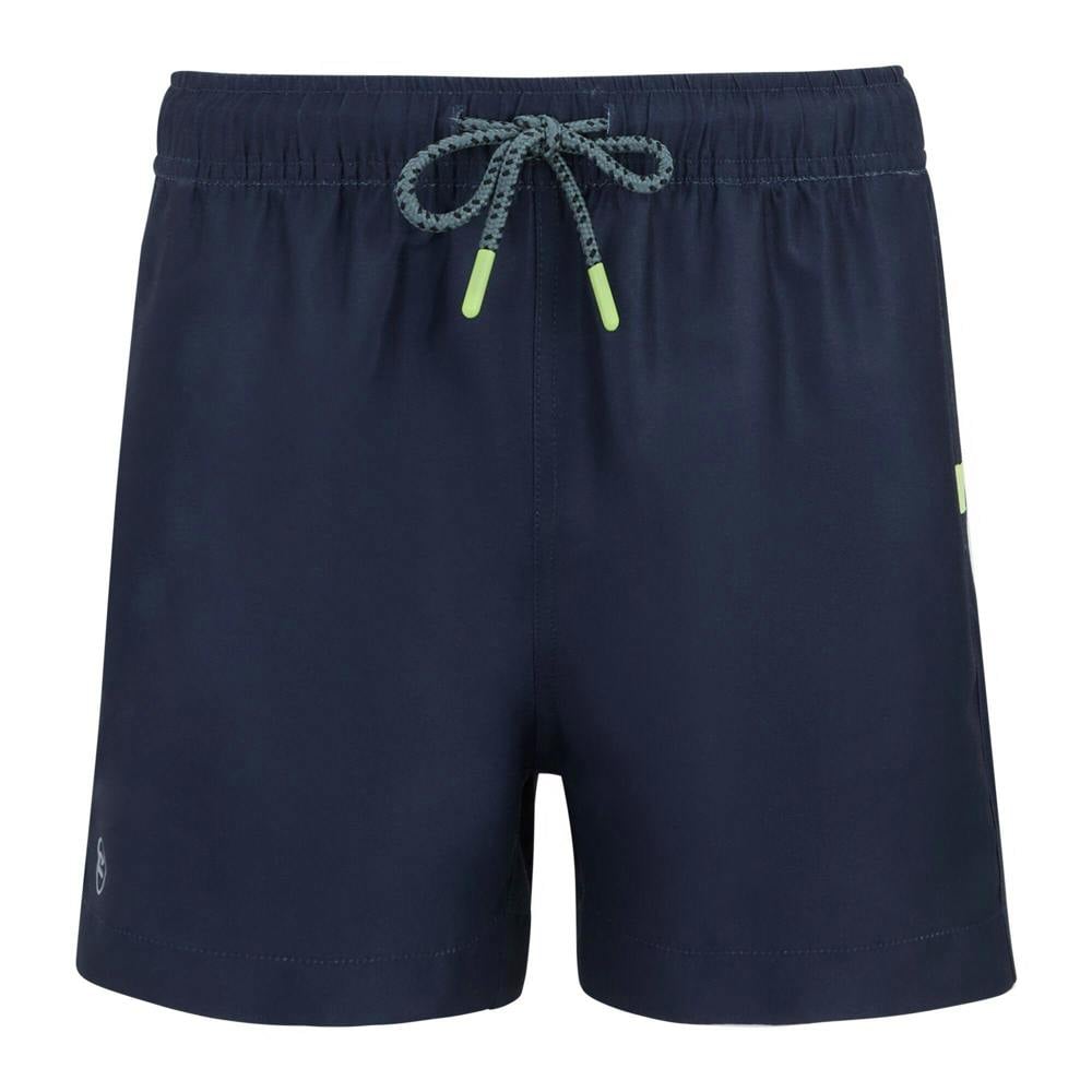 Regatta Kids Skander swim shorts in navy, made from 100% recycled polyester microfibre with a mesh lining. The lightweight, quick-dry fabric is finished with a logo design and an elasticated waistline for a secure fit.