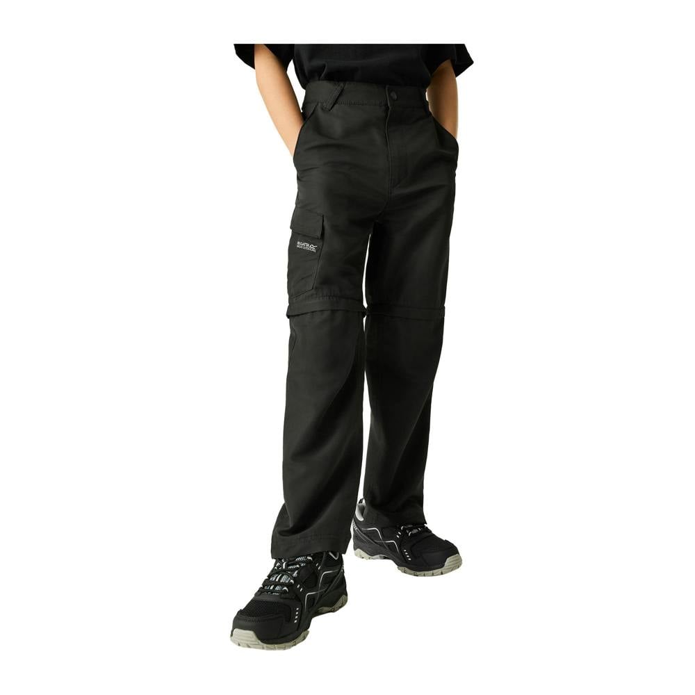 Regatta Kids Sorcer III Zip-Off Trousers in black with a plain finish and logo detail. Made from 70% polyester and 30% recycled polyester in a 105gsm fabric. Crease resistant, lightweight and quick dry fabric technology.