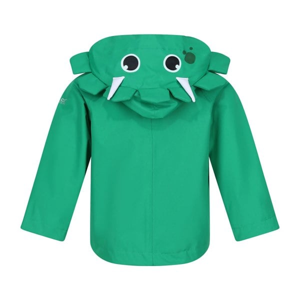 Regatta Kids Stompy The Dinosaur Waterproof Jacket in Jellybean Green is made from 100% polyester Hydrafort fabric with a taffeta lining. The design includes dinosaurs, eyes and a logo, with a branded sleeve. A grown on hood adds 3D horns for a distinctive look, while the long sleeves and full zip fastening keep the finish practical and easy to wear.