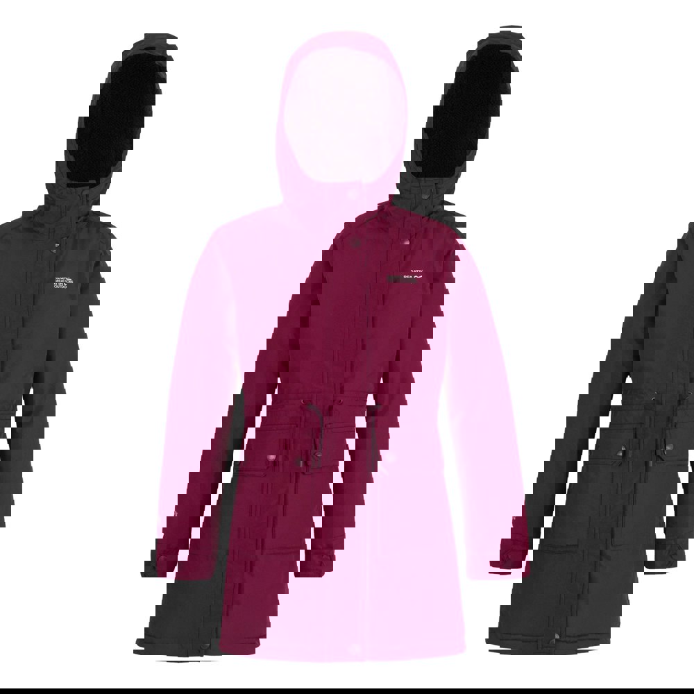 Regatta Kids Valenta Waterproof Jacket in Dark Pimento. Made from recycled materials, this long, hooded jacket uses a 100% polyester outer (110gsm) with a taffeta lining and 180gsm synthetic insulation. The down-touch Warmloft filling adds warmth, while Isotex 15000 fabric technology combines waterproof and windproof protection with a durable water repellent finish and breathable performance (15000g/m²/24hrs).