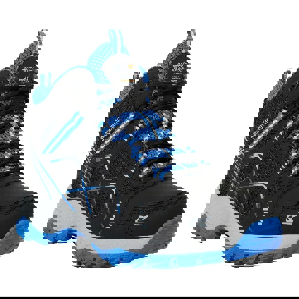 Regatta Kids Vendeavour walking boots come in black and Oxford blue with a low-cut shape and a round toe. The upper combines mesh, polyester and PU (polyurethane), finished with contrast detailing and a logo. A lace-up fastening runs through seven eyelets for a secure fit, and a pull tab supports easier on and off.