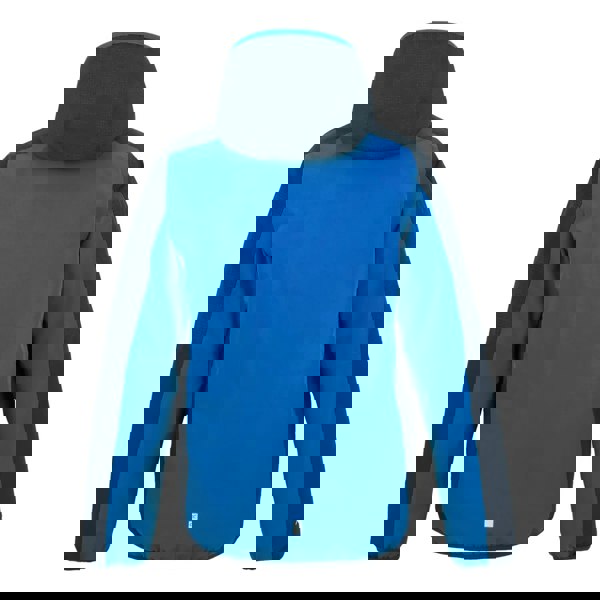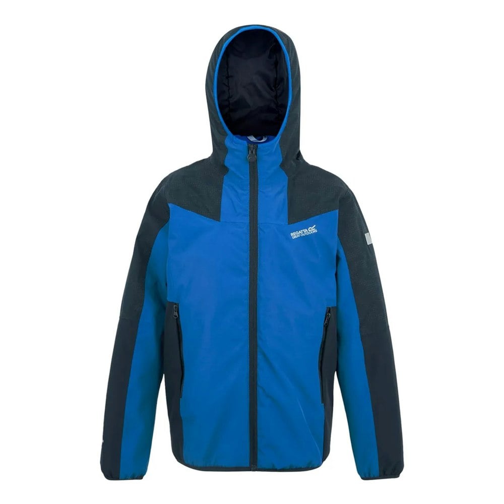 Regatta Kids Volcanics Reflective Waterproof Jacket in navy/snorkel blue. Made from recycled materials with a 100% polyester outer, this hooded, long-sleeved jacket uses Isotex fabric technology with a durable water repellent finish. Waterproof and windproof construction is supported by taped seams, with a breathable rating of 15000g/m²/24hrs.