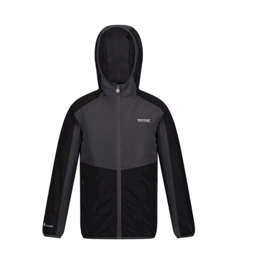 This kids’ Volcanics VI jacket from Regatta comes in black and dark grey with a colour block design and logo detailing. Made from 100% polyester with a soft-touch fabric, it uses Isotex 5000 waterproof technology with sealed seams and a DWR finish. The fabric is lightweight, breathable and abrasion resistant, with stretch and insulating Thermo-Guard technology.
