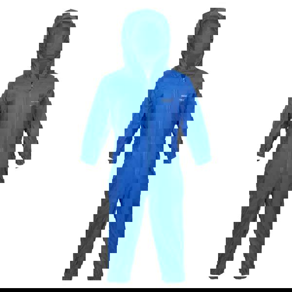 Built for wet-weather days, the Regatta Kids Waterproof Puddle Suit is a one-piece outer layer in oxford blue with a plain finish. Made from 100% polyamide, it has a lightweight, breathable and waterproof construction, supported by taped seams. A grown on hood and high-neck shape add coverage, while long sleeves and elasticated cuffs help keep the fit secure. The full zip fastening makes it easy to put on and take off.