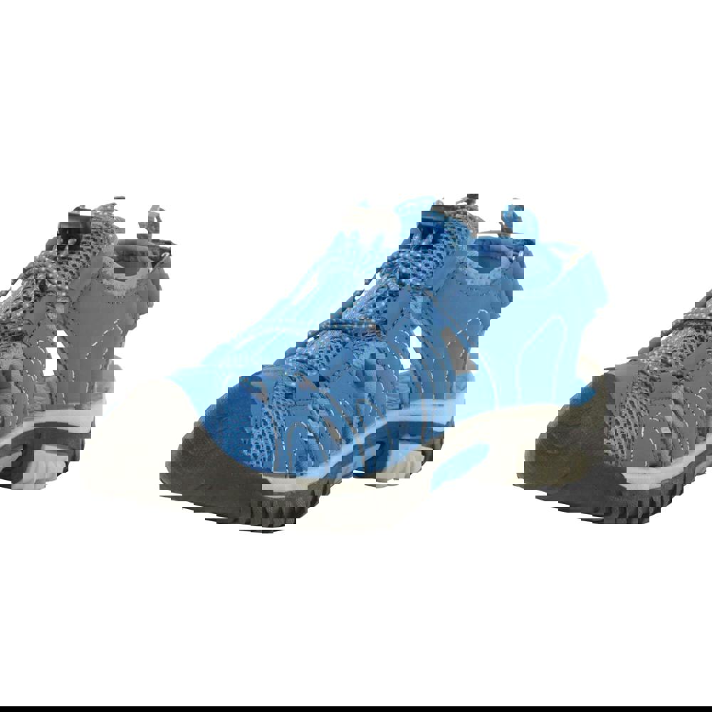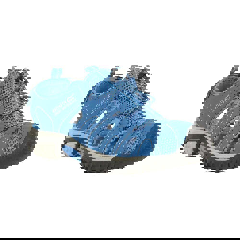 Regatta Kids Westshore Sandals in Petrol/Blue Aster combine a low cut profile with a low heel and a bumper toe style. The upper uses mesh and synthetic nubuck, with a spandex lining and an EVA (Ethyl Vinyl Acetate) insole. A rugged TPR outsole completes the construction.