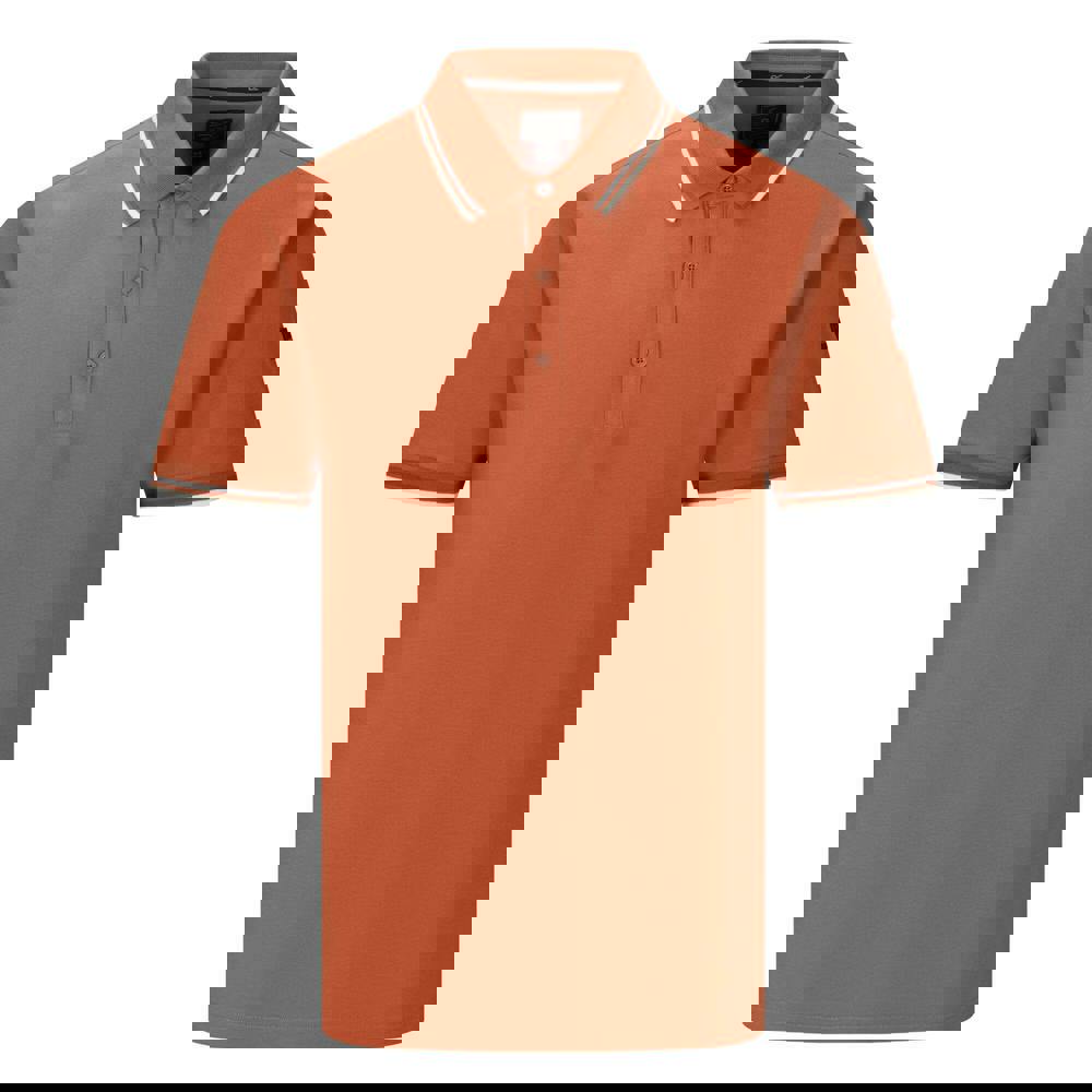 The Regatta Adryan polo shirt comes in brick and is made from 95% cotton and 5% elastane in a piqué fabric. It has a tipped design and a ribbed, turn down collar for a classic polo finish. Short sleeves and ribbed cuffs keep the look neat and structured, while forward shoulder seams and side vents add detail to the construction.