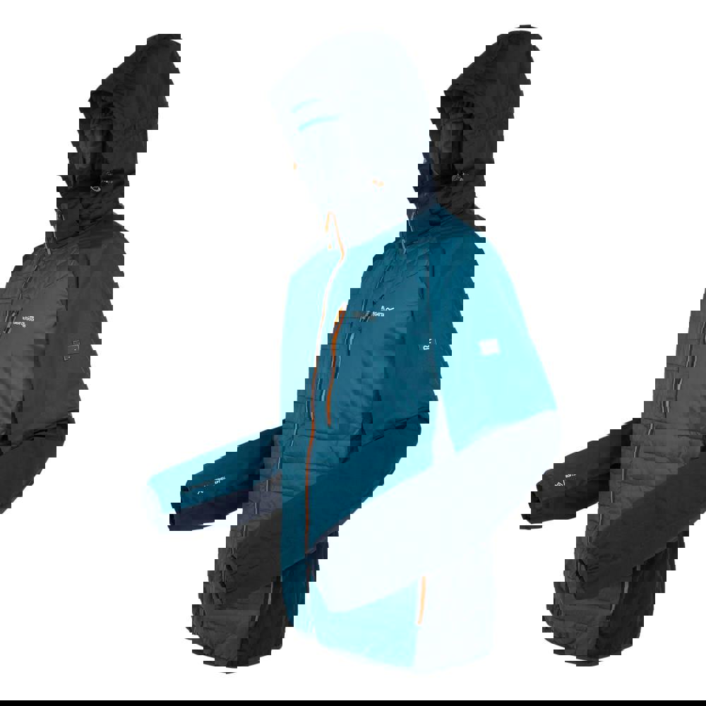Built for outdoor wear, the Regatta Andreson Pro hybrid jacket comes in Moroccan blue, navy and fox with contrast detailing and a logo finish. It combines ripstop, softshell and stretch panels with a down-touch filling, alongside XPT technology. The design is compressible and includes a hooded neckline with an adjustable, detachable hood, plus long sleeves with elasticated cuffs.