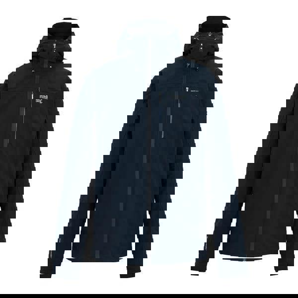 The Regatta Mens Birchdale II Waterproof Jacket in navy is made from 100% recycled polyester with a mesh lining and stretch fabric. It has a plain base with contrast detailing and logo branding, plus a 165gsm construction. The hooded neckline includes a grown-on technical hood with 2 way adjusters for a secure fit.