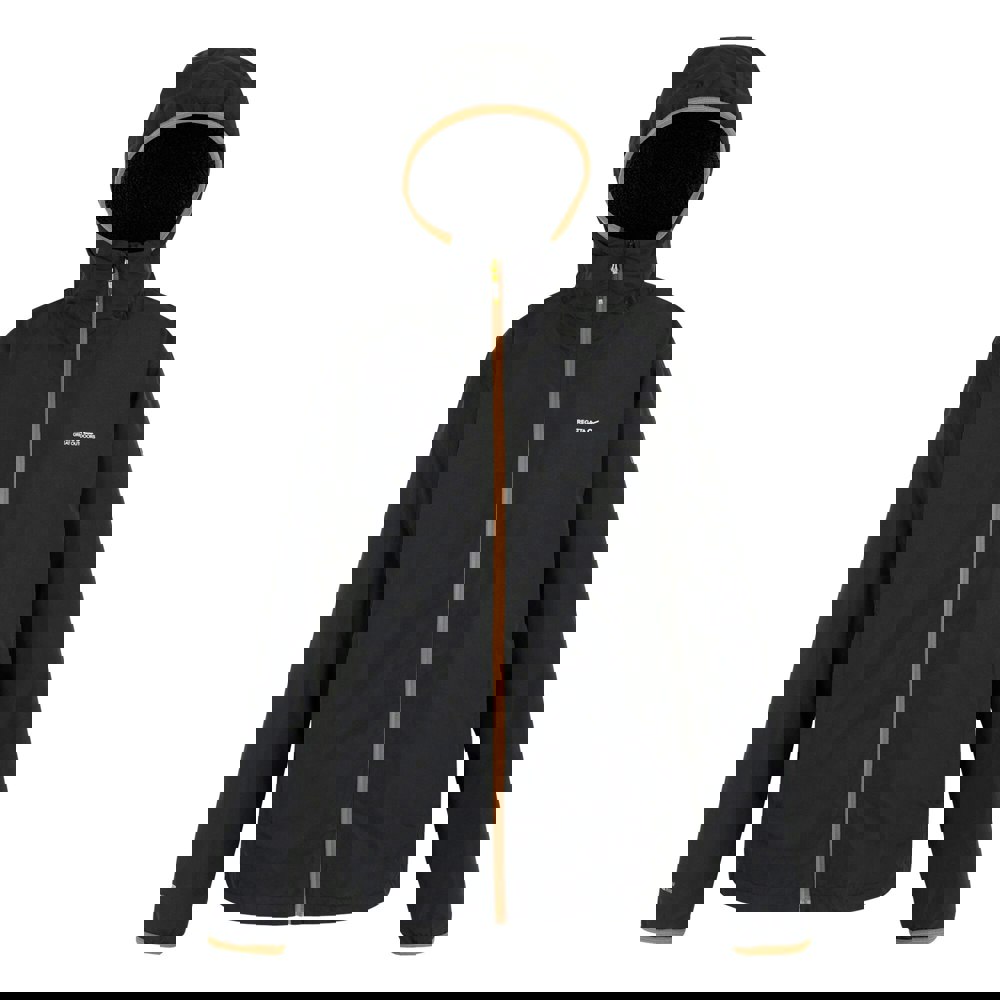 Built from 100% polyester, this Regatta Caspen waterproof jacket comes in black with a plain finish and logo detail. The outer fabric is 110gsm, paired with a borg fleece lining and a down-touch synthetic insulated filling at 60gsm.