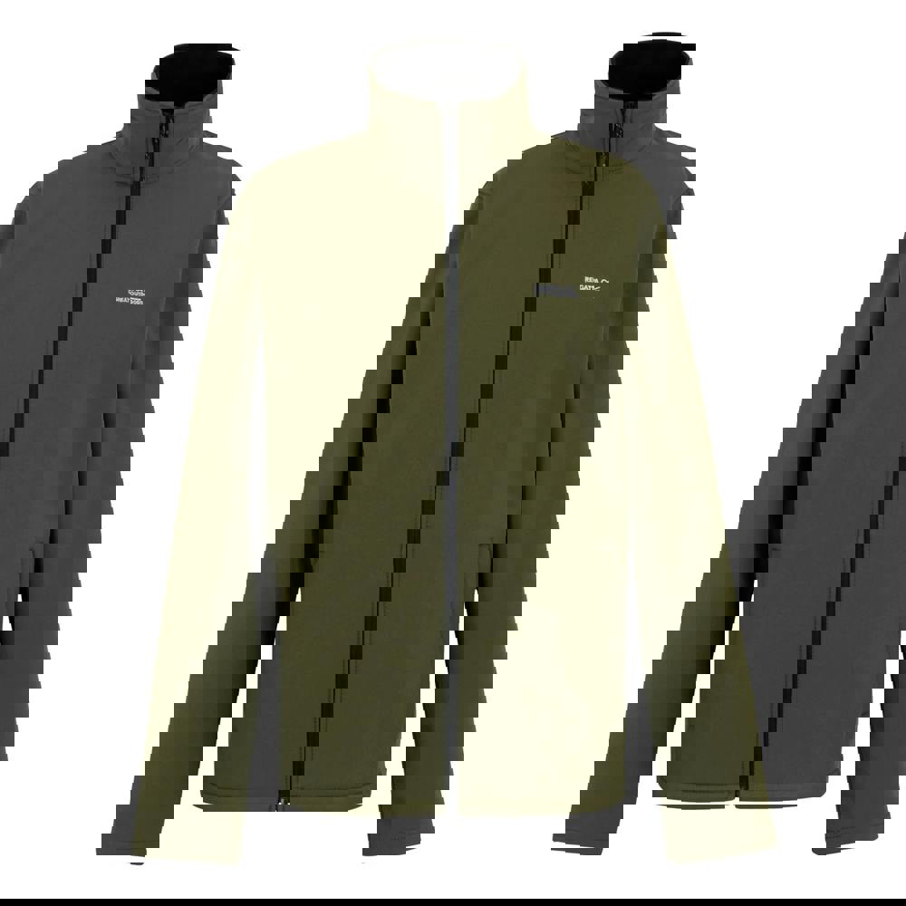 This soft shell jacket from Regatta comes in Olive Night with a plain finish and logo detail. It has long sleeves and a standing collar, finished with a full zip fastening for a clean, practical look.