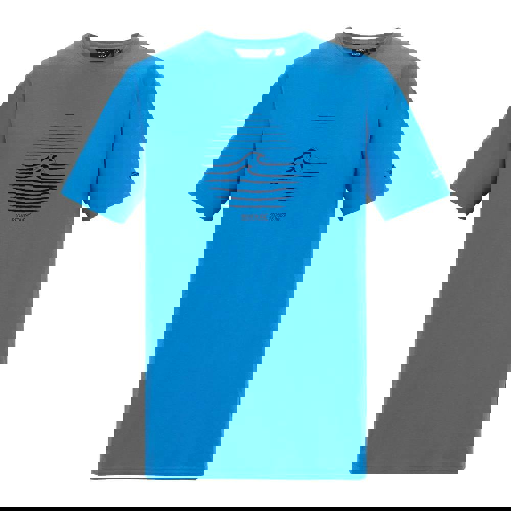 The Regatta Cline IX Wave T-shirt comes in Sonic Blue with a jersey construction and a 160gsm fabric weight. It is made from 95% cotton and 5% viscose, finished with a crew neckline and short sleeves for a classic T-shirt shape.