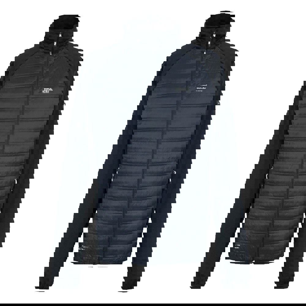 This hybrid jacket from Regatta comes in navy with a printed logo design. It is made from elastane, polyamide and polyester, with a 37gsm construction. The fabric uses a durable water repellent finish and is described as flexible and lightweight, with Warmloft insulation.