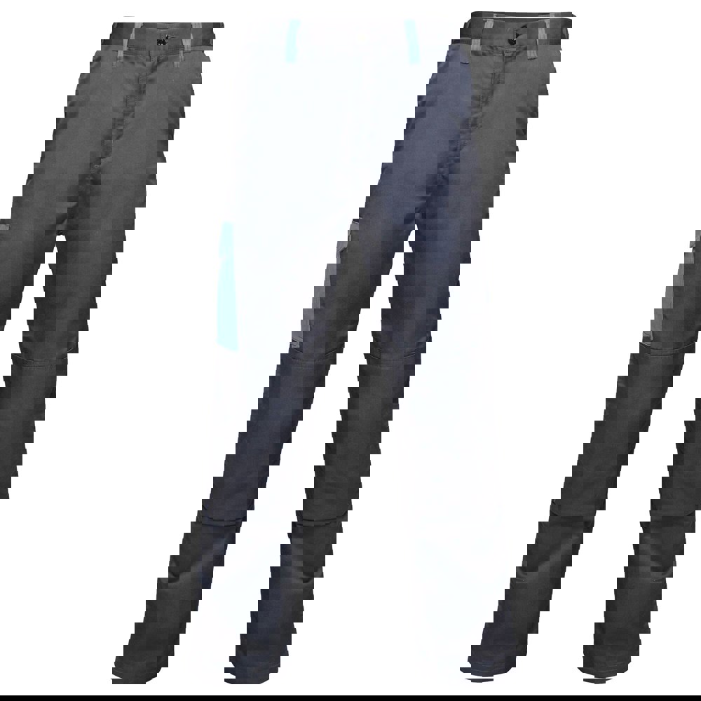 Multiple pockets keep essentials organised, with front, cargo and rear options alongside a side leg ruler pocket. Knee pad pockets and a D-ring attachment complete the utility-led construction, finished in navy with New Royal Blue contrast.