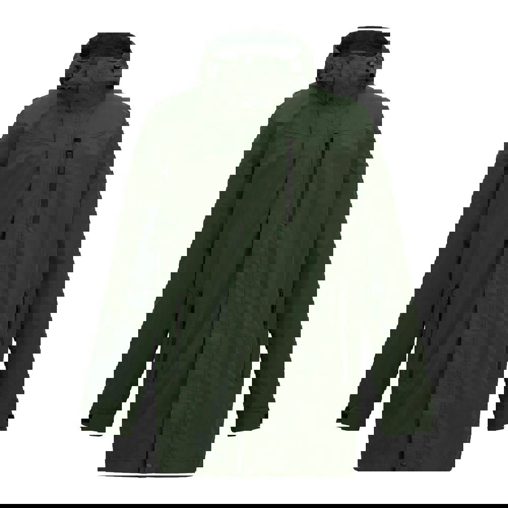 Fabric technology includes Isotex 15000 with a durable water repellent finish, alongside breathable, waterproof and windproof properties. The lining combines embossed, mesh and taffeta fabrics. Storage is arranged with two lower welted pockets, a zipped chest pocket and a security pocket.