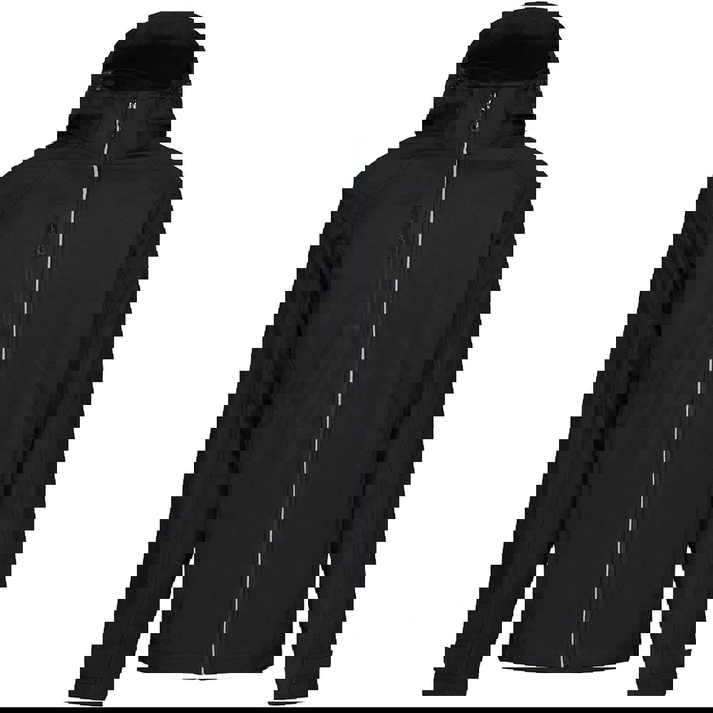 This men’s soft shell jacket is made from polyester with a triple layer fabric and a microfleece lining. It has a plain finish in black and a regular fit with a regular length, suited to everyday outerwear and layering.