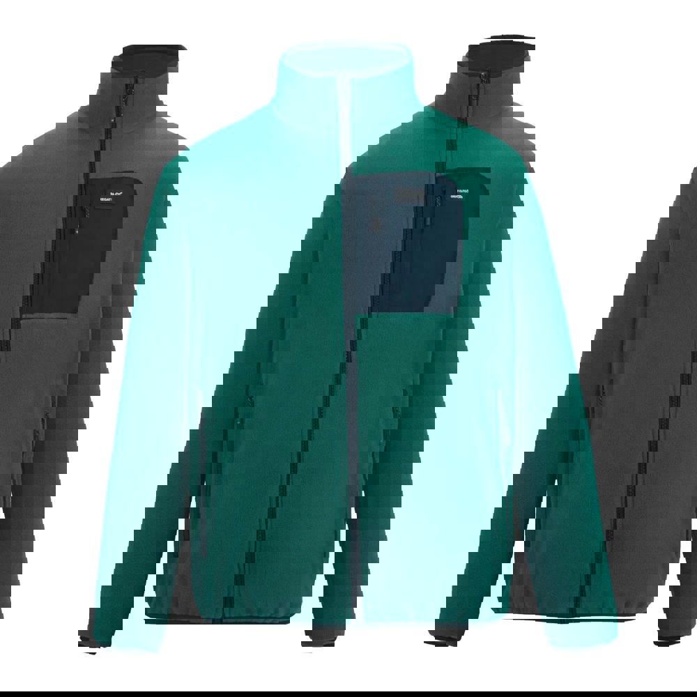 This full zip fleece jacket is made from a 70% polyester and 30% recycled polyester blend. The fabric combines microfleece, poplin and stretch, with a 210gsm weight and a soft handle. Finished in Mediterranean green and navy, it uses contrast colour detailing with a logo patch for a clean, sporty look.