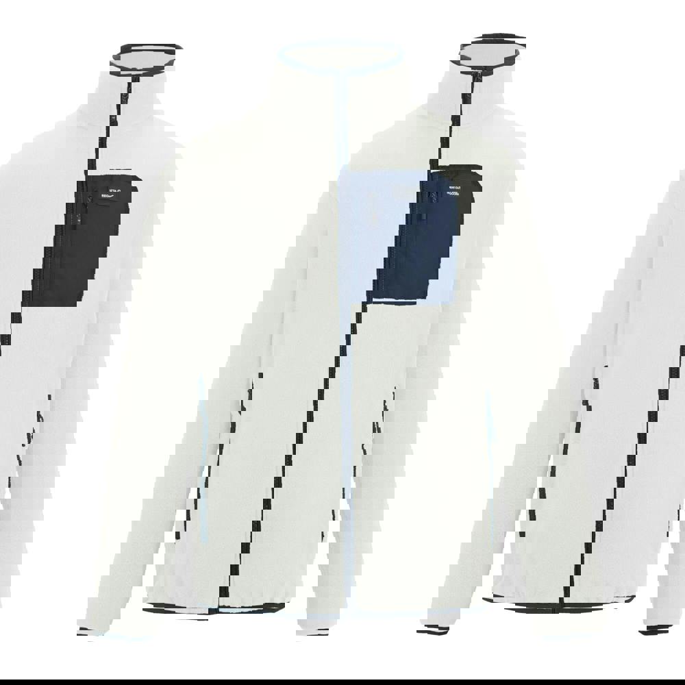 This full zip fleece jacket is made from a blend of 70% polyester and 30% recycled polyester. The fabric combines microfleece, poplin and stretch, with a 210gsm weight and a soft handle. Finished in White Stone/Navy, it uses contrast colour detailing with a logo and patch design.