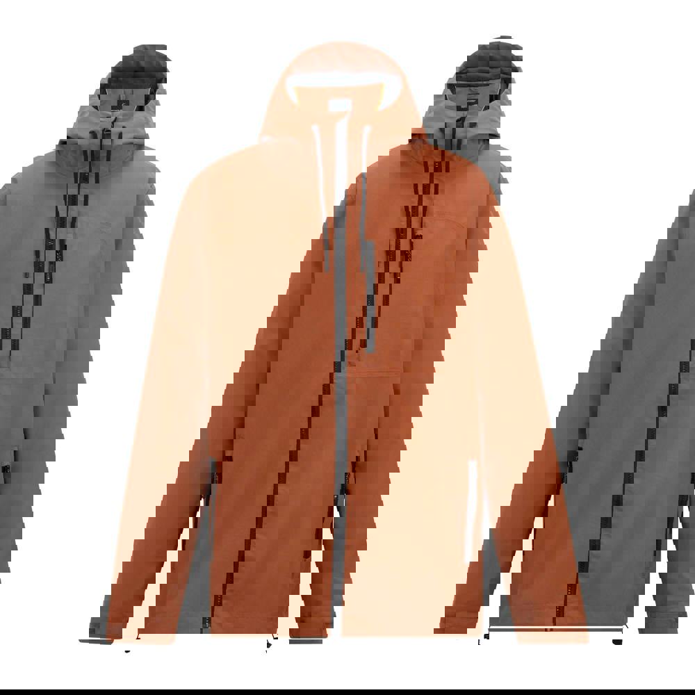 Regatta Frankie waterproof jacket in brick red with a plain finish and logo detail. Made from recycled polyester with a cotton canvas fabric and taffeta lining, it is constructed with taped seams and Isotex 15000 fabric technology. The jacket is hooded with a grown-on hood and long sleeves, finished with hook and loop cuff straps and a drawcord hem.