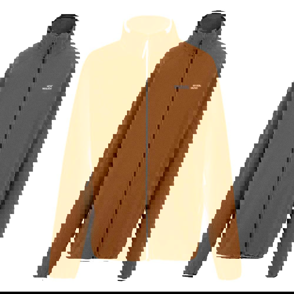 This microfleece jacket is made from 100% polyester and finished in a plain nut brown with logo detailing. It has a standing collar and long sleeves, with stretch binding at the cuffs and hem for a neat, secure edge.