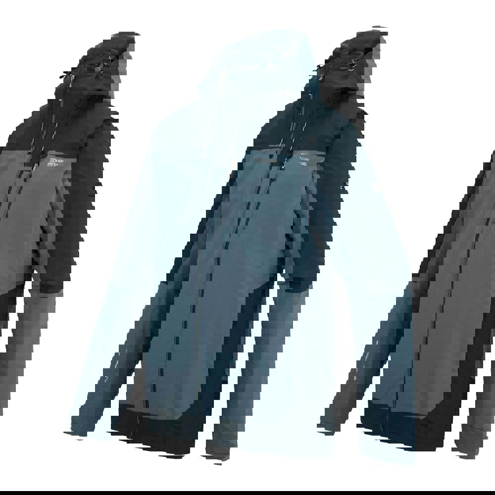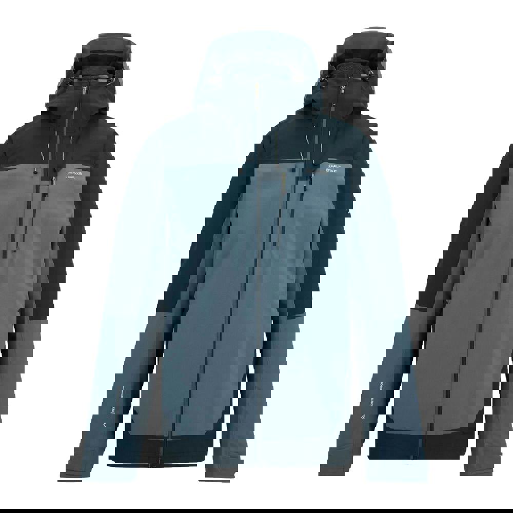 Long sleeves with adjustable cuffs and a shockcord hem help fine-tune the fit. Storage is handled by two side pockets, a chest pocket and a security pocket, all with zip closure. A grown-on technical hood with toggle adjuster and wired peak completes the outerwear profile.