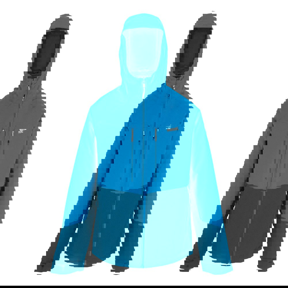 Isotex 15000 fabric technology delivers a durable water repellent finish and waterproof performance, supported by taped seams and a drainage channel. The hooded neckline includes a grown-on, sew-on hood, while long sleeves are finished with adjustable cuffs and touch fastening tabs. Storage is organised with zipped pockets across the chest, sides and interior, and the full zip fastening is complemented by a shockcord hem.