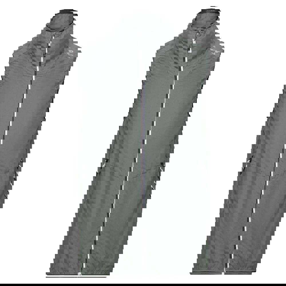 Regatta Lankin VI softshell gilet in agave green with citron lime detailing. Made from 100% polyester with stretch softshell fabric, it has a sleeveless cut for easy layering and a standing collar finished with stretch binding. A full-length contrast zip fastens through the front, supported by an inner zip guard.