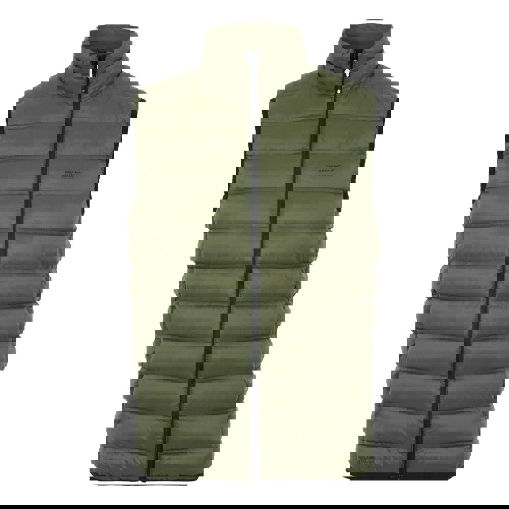Regatta Marizion quilted gilet in Olive Night. Made from 100% polyamide, this sleeveless layer has a standing collar and a full zip fastening. The lightweight construction includes feather free down fill and insulation, with a DWR finish and a snug fit.