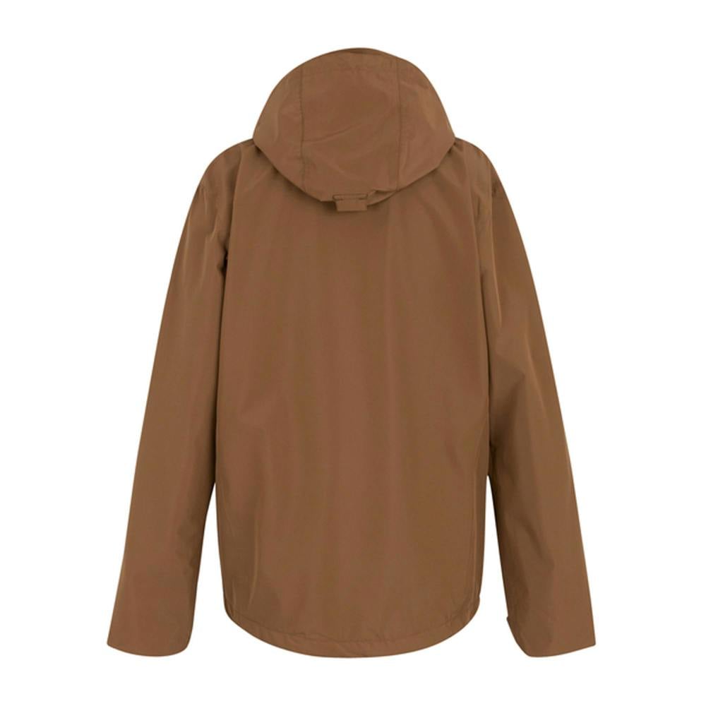 A hooded neckline combines a standing collar with a concealed hood and toggle adjuster. Long sleeves are finished with adjustable cuffs, while the hem is secured with a shockcord adjuster. Storage is arranged across multiple zipped pockets, including chest, side and inner compartments. The jacket is made from recycled materials and is lined with mesh, polyester and taffeta.