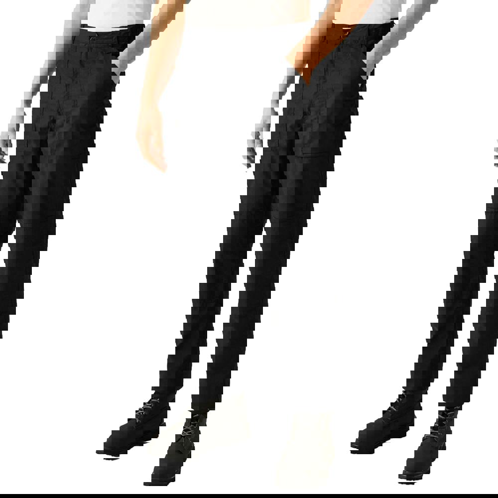These lined action trousers are made from polycotton and finished in black. A durable water repellent finish and warm scrim lining add practical detail for outdoor wear. The waist is part elasticated and includes belt loops, while knee patches reinforce the design.