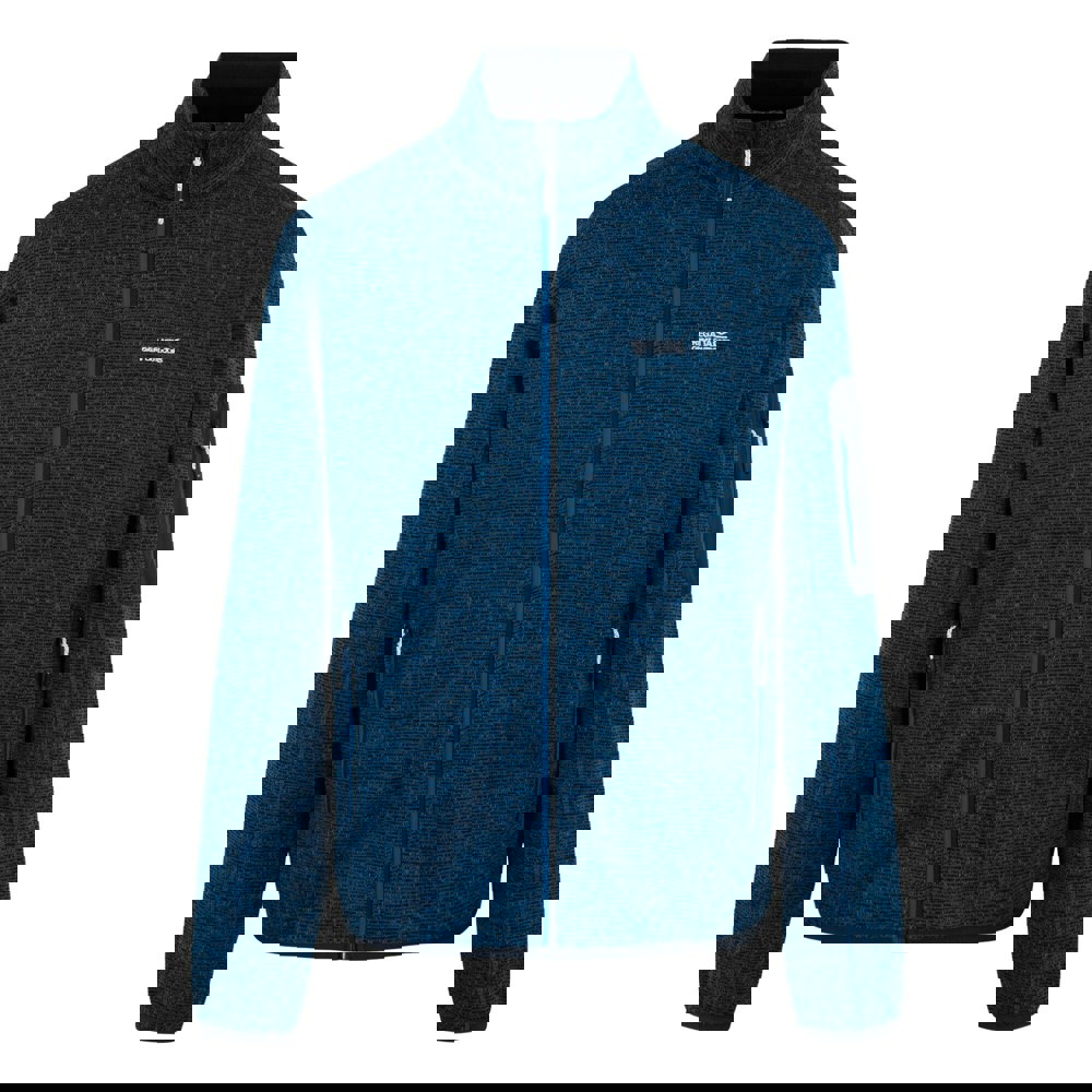 This full zip fleece jacket is made from 70% polyester and 30% recycled polyester, with a 280gsm brushed-back knitted marl fabric. The snorkel blue design includes contrast detailing and a logo, finished with a high neck and long sleeves.
