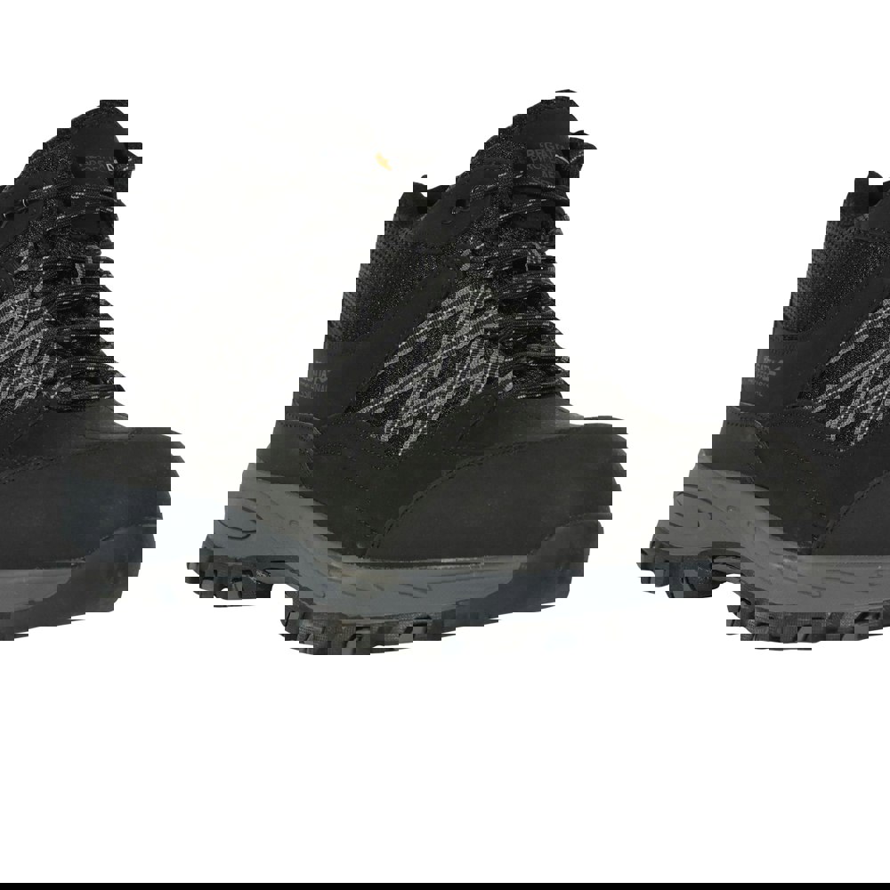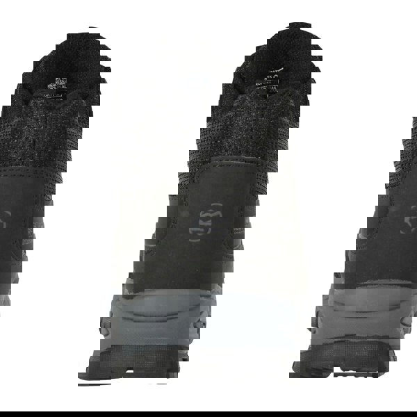 Regatta Sandstone safety boots in black/granite with a low-cut profile and flat sole. The upper combines mesh, nubuck and PU (polyurethane), paired with an EVA (ethyl vinyl acetate) midsole. A lace-up fastening with six eyelets secures the fit, while a padded collar and padded tongue add comfort-focused structure.