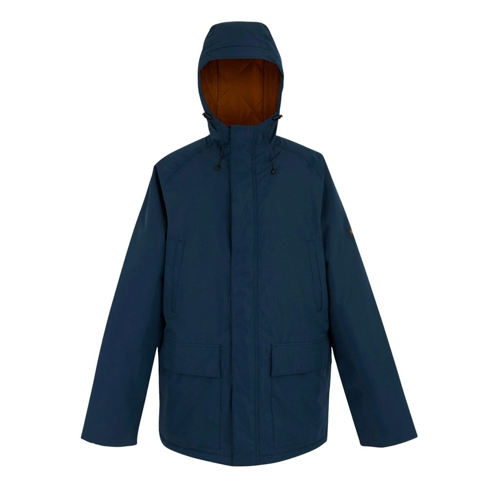 Regatta Savon insulated waterproof jacket in navy blue/glazed ginger. Made from 100% polyester with a Thermo-Guard insulated filling (140gsm) and a quilted taffeta lining. The outer fabric weight is 110gsm.