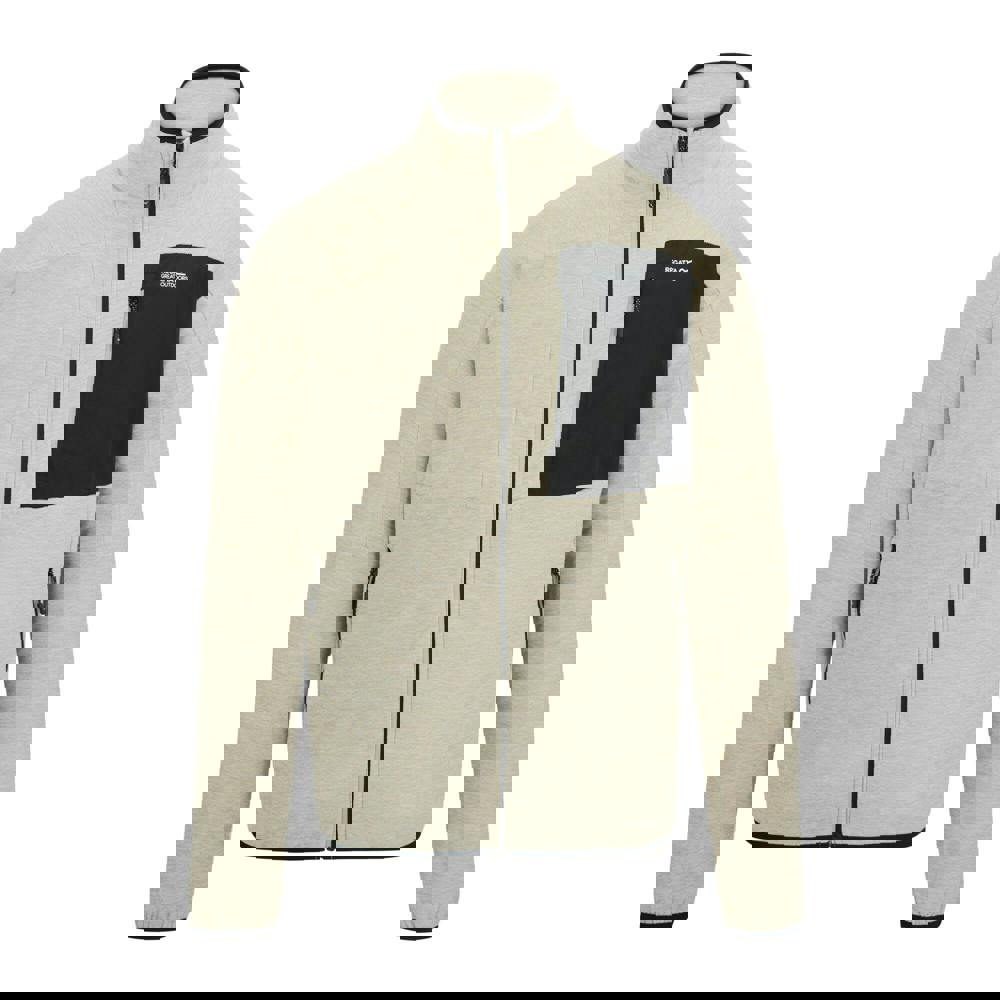 The Regatta Scaris full zip fleece jacket in Abbeystone is made from 70% polyester and 30% recycled polyester. The brushed-back fleece has a soft-touch finish with added stretch, keeping the look clean with a plain base, contrast panels and a logo detail.