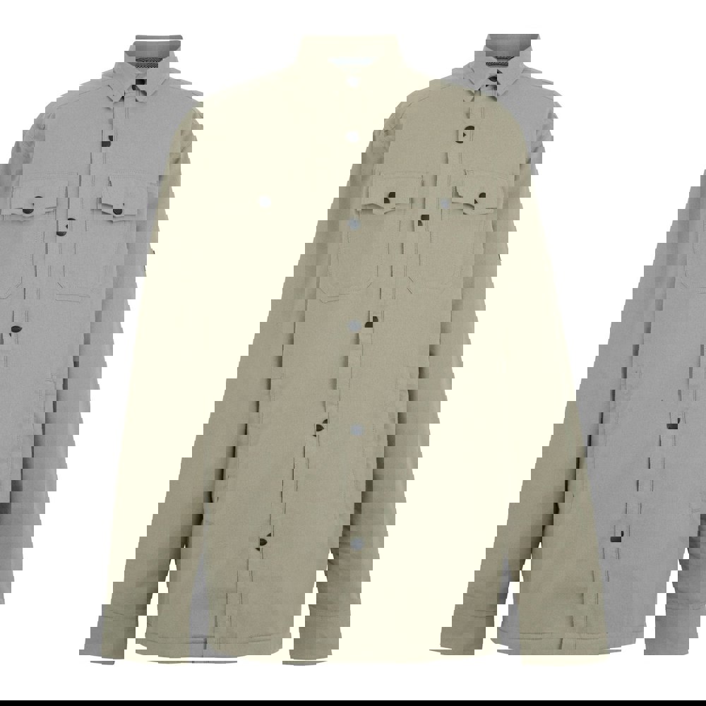 Storage is built in with two chest pockets and two side pockets. The chest pockets sit under flap closures with button fastening, and a sleeve patch adds a defined detail to the arm.