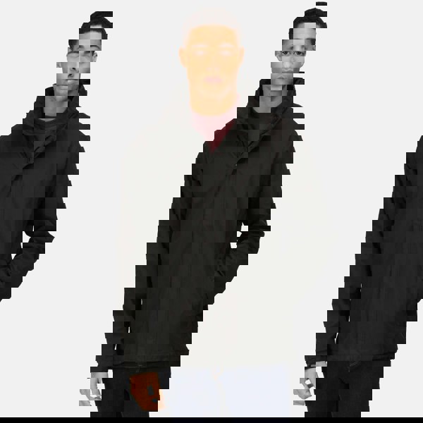 This men’s jacket is made from peached polyester with a waterproof Hydrafort 5000 coating and windproof fabric. Polyester mesh lining adds a lightweight internal layer, while taped seams support weather protection. A concealed hood with an adjuster offers a neat finish when not in use.