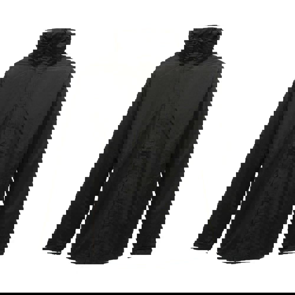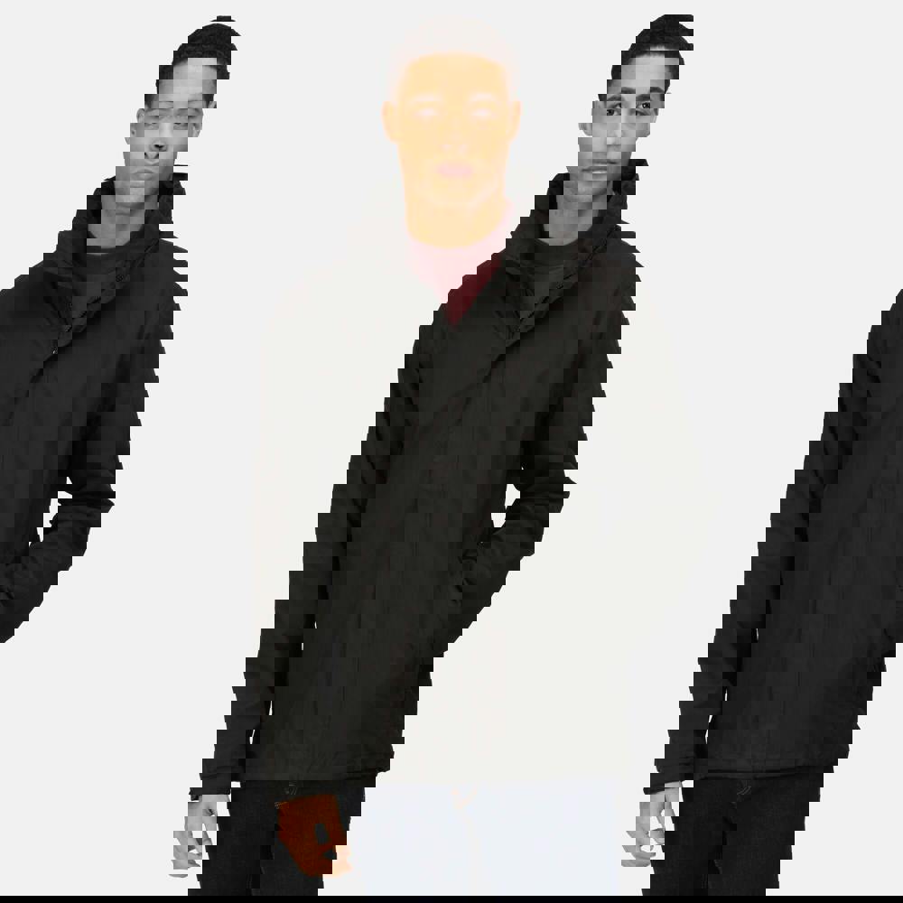 The Regatta Mens Standout Ardmore Jacket in black is made from waterproof Hydrafort 5000 coated peached polyester with a windproof fabric construction. Taped seams add further protection, while a polyester mesh lining provides a clean internal finish. A concealed hood with an adjuster offers optional coverage when needed.