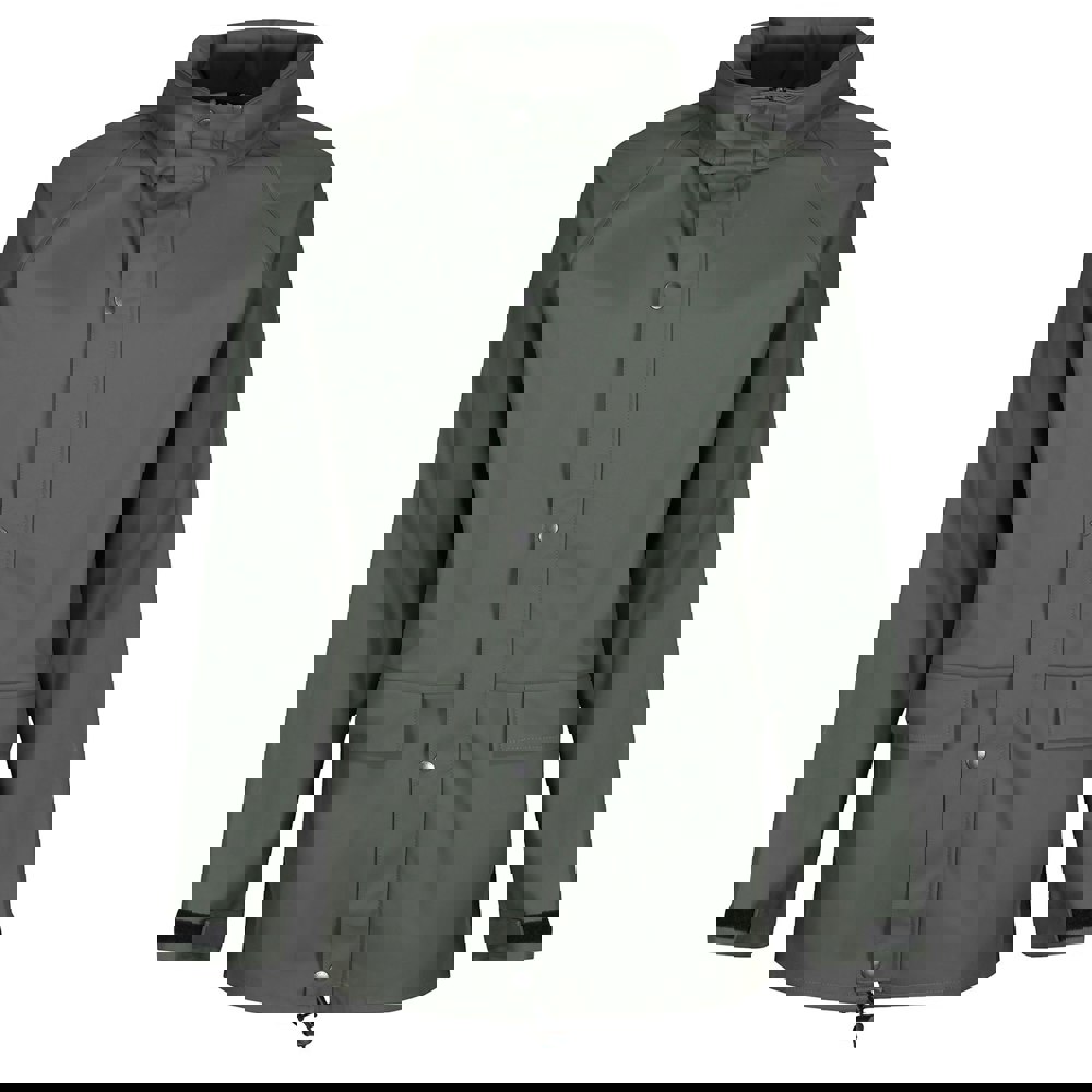 Regatta Stormflex II jacket in olive green, made from 100% polyester with a knitted, PU and tricot construction. The plain design is finished with a hooded neckline and standing collar, paired with long sleeves for practical coverage.