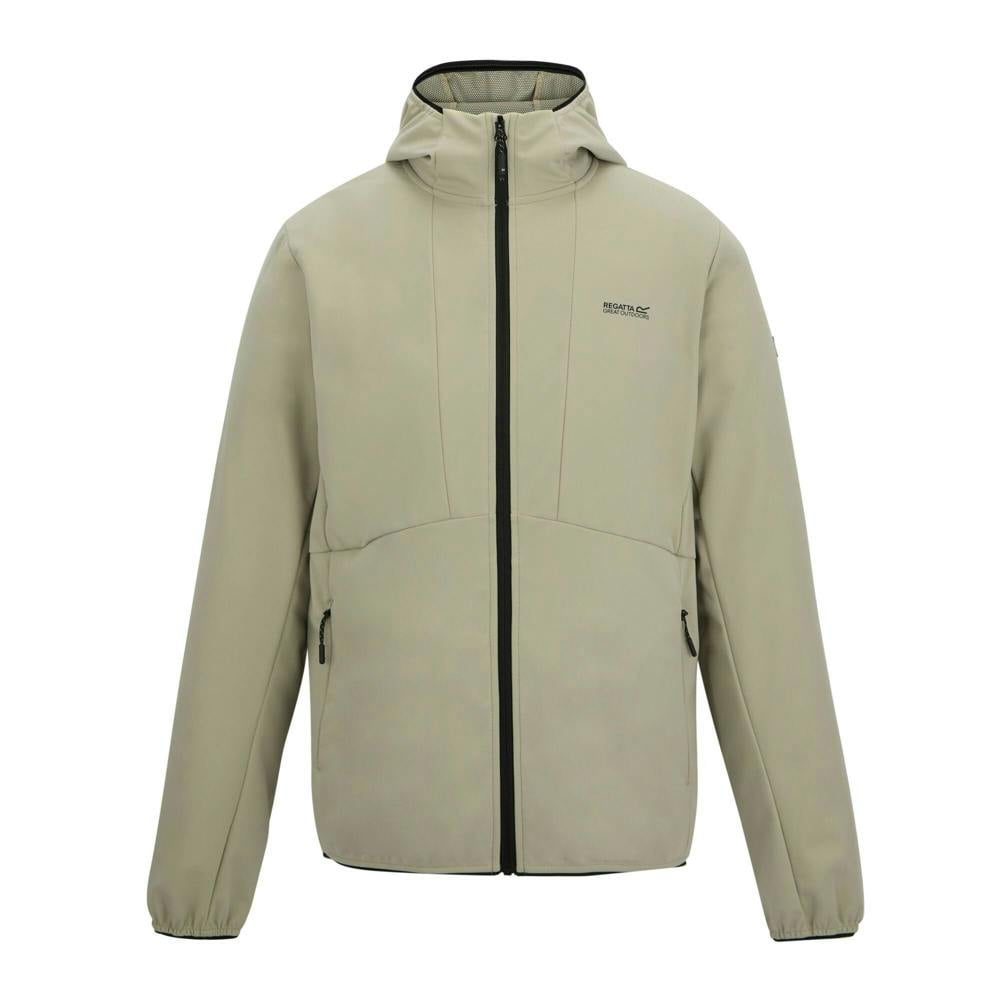 Regatta Tredmoor soft shell jacket in Abbeystone. Made from polyester and recycled polyester, it uses honeycomb softshell fabric with a 200gsm weight. The jacket has a hooded neckline and long sleeves, finished with stretch binding at the cuffs and hem. A full zip fastening and pit zips add practical ventilation and easy on-and-off wear.