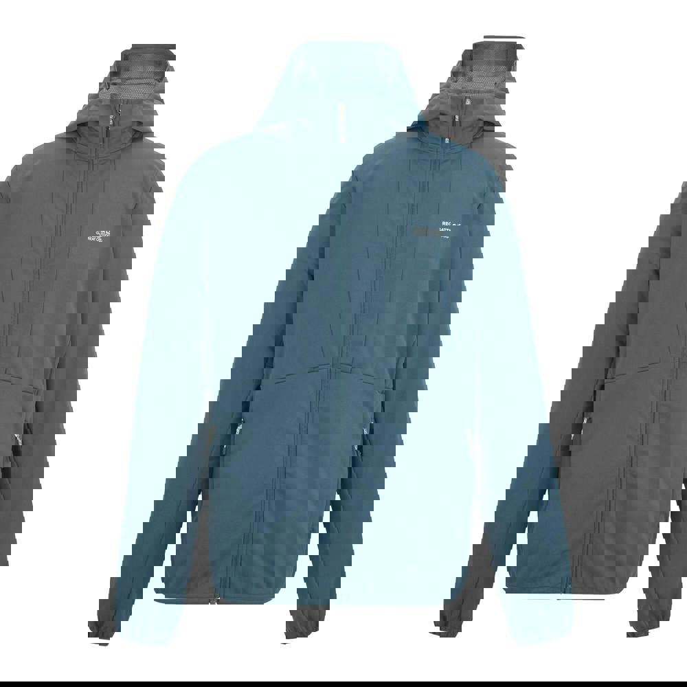 Regatta Tredmoor softshell jacket in China Blue, made from polyester and recycled polyester with a honeycomb softshell construction. The hooded neckline and long sleeves are finished with stretch binding at the cuffs and hem, keeping the edges neat and secure. A full zip fastening runs through the front, with pit zips included for added ventilation.