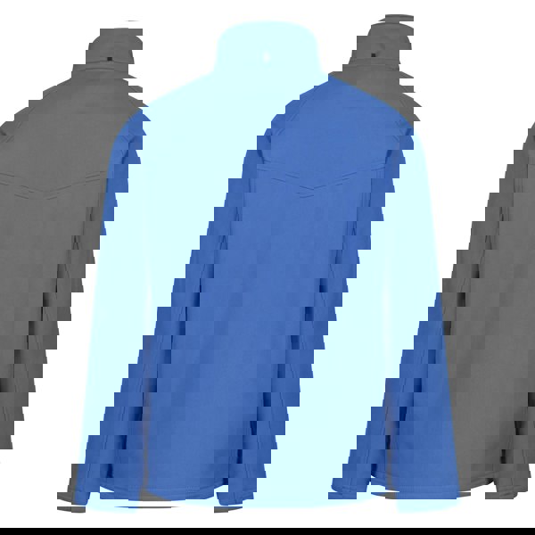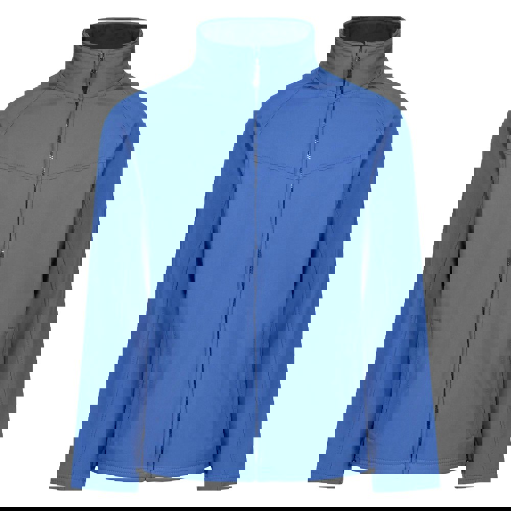 Regatta Uproar soft shell jacket in royal blue with a plain finish and woven double-layer fabric. The outer is made from 96% polyester and 4% elastane, with a fleece-backed construction for added structure. A high-neck collar and full zip fastening create a clean, practical profile, while raglan sleeves and open cuffs keep the shape streamlined.