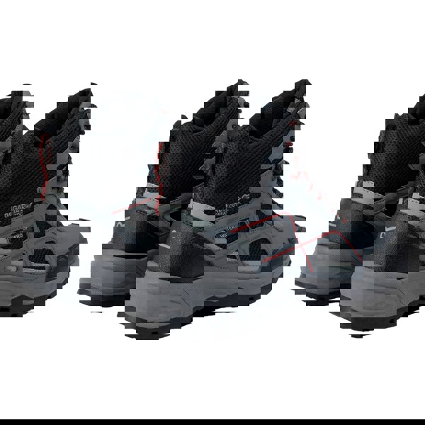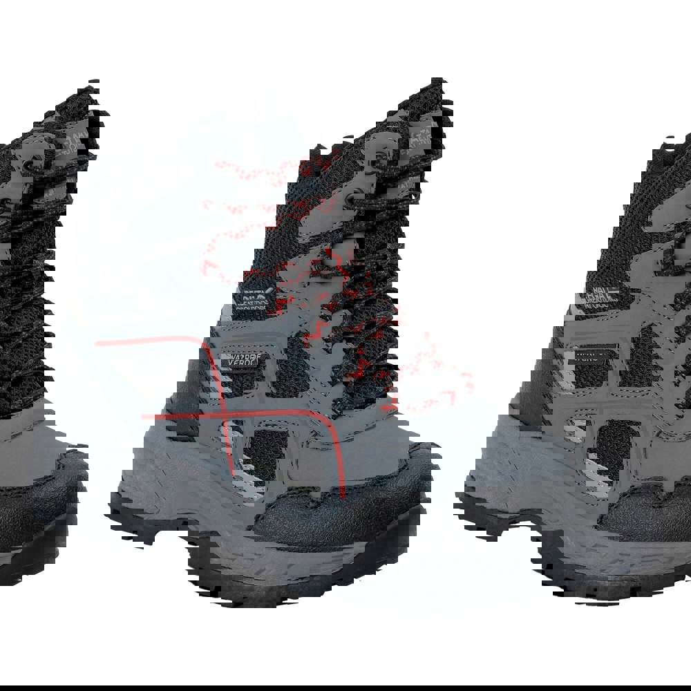 Regatta Vendeavour walking boots are built with a mesh, polyester and PU (polyurethane) upper, finished in Granite/Rio Red. The ankle cut and round toe create a practical shape for walking, while ghillie lacing secures the fit. A flat heel keeps the profile streamlined, and a logo detail completes the design.