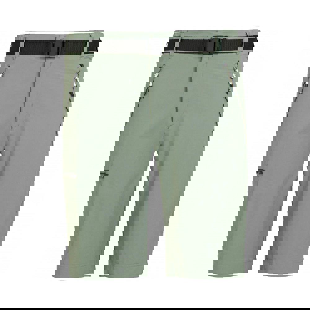 The waistband is part elasticated and includes belt loops plus a detachable webbing belt. Storage is provided by two side pockets and one back pocket with a zip. A button and zip fastening completes the front. Fabric technology includes Isoflex, a DWR finish, breathable and quick dry properties, along with a precision fit and ergonomic fit.