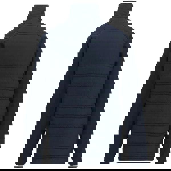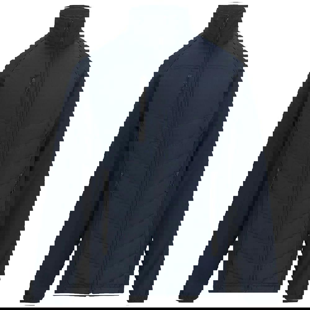 Regatta Professional Pro Universal jacket in navy/ash with a quilted finish and logo detailing. Made from Extol Stretch softshell with a recycled Thermo-Guard filling and a recycled polyester taffeta lining. The long raglan sleeves and standing collar are paired with a chin guard and inner zip guard, while stretch binding at the cuffs and hem keeps the edges neat. Built with breathable, shower resistant and waterproof fabric technology, and finished with side panels and access for decoration.