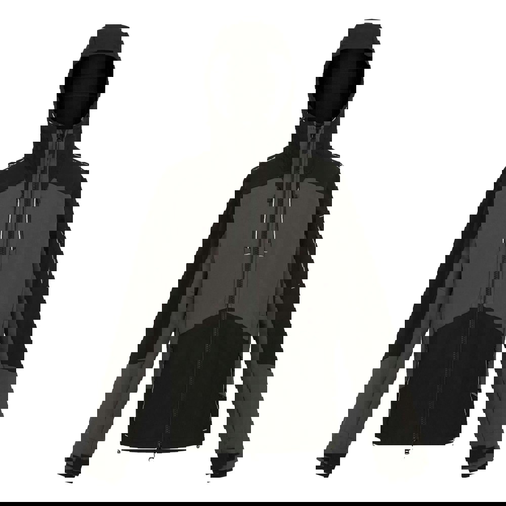 This men’s softshell jacket is made from a 3 layer stretch fabric with a woven construction and colour block design in slate grey and black. The hooded neckline and long sleeves create a practical outer layer for everyday wear, with a full zip fastening and a zip puller for easy use.