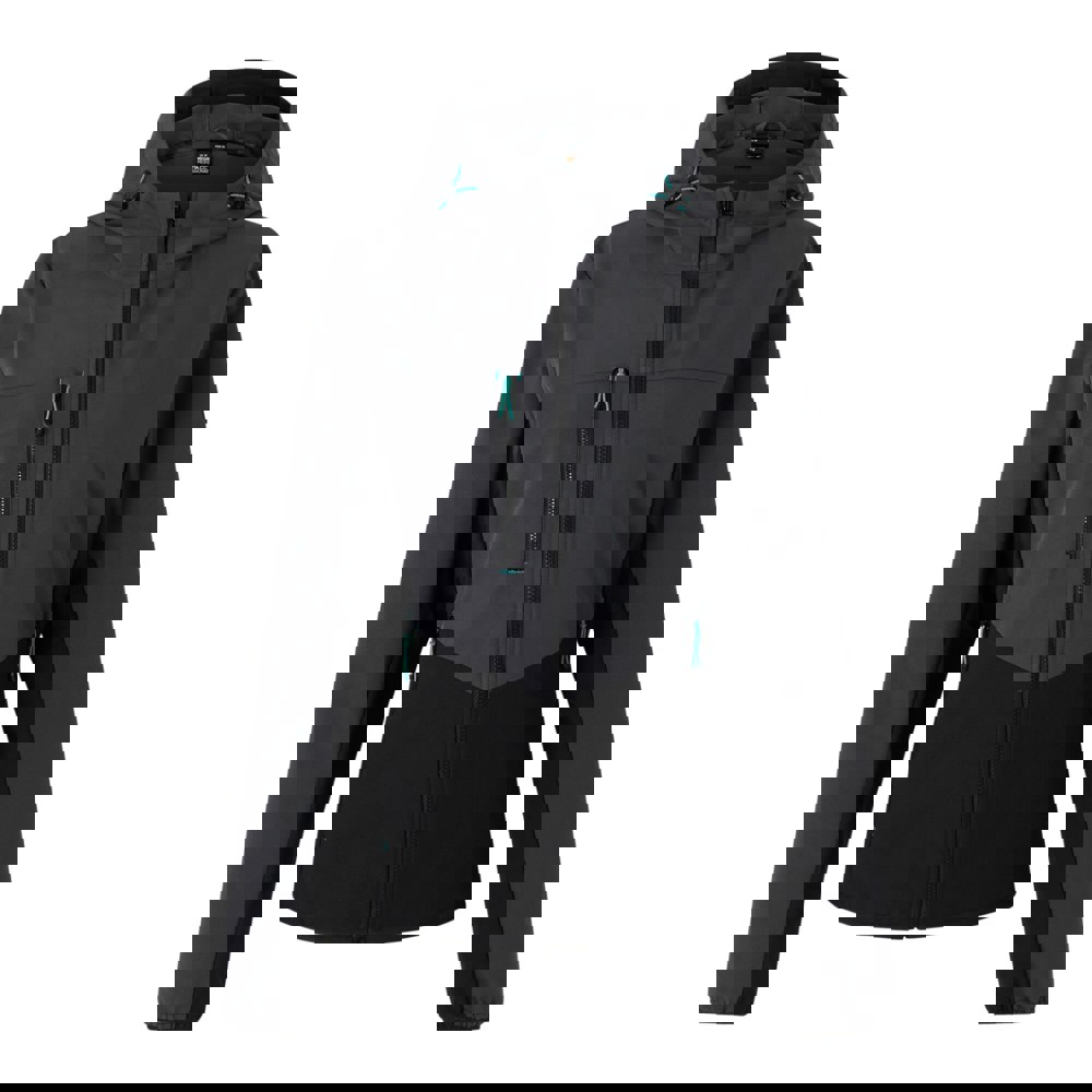 This softshell jacket is made using recycled materials and a woven, double layer construction with 4 way stretch and ultra stretch for flexible wear. It comes in a plain slate grey and black colourway with contrast detailing and reflective detail for added visibility.