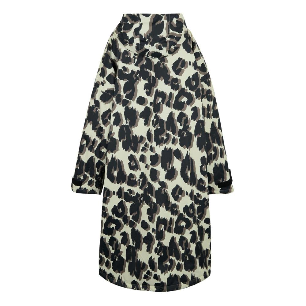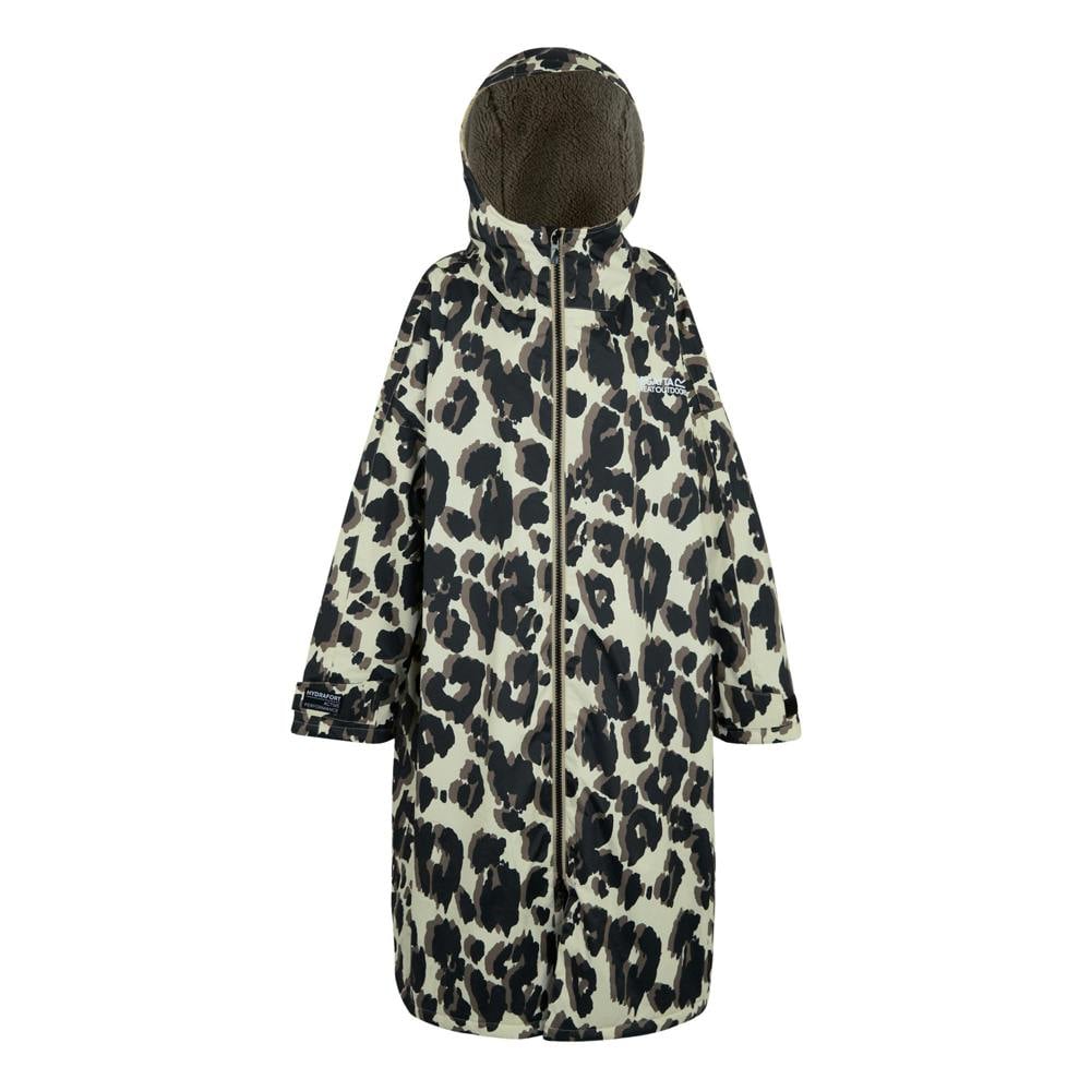 This unisex adult changing robe is made from 100% recycled polyester with Hydrafort 5000 fabric and a borg fleece lining. It has a multicoloured leopard print design with logo detailing and a 200gsm construction. The robe is hooded with a standing collar and long sleeves, finished with taped seams.